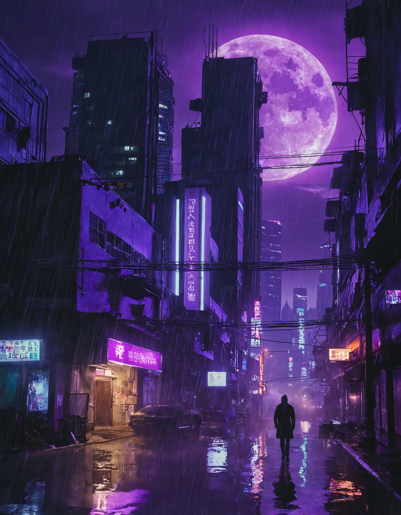<lora:r0k00g00th:1>,r0k00g00th,r0kur3&l1tyHD. cyberpunk art,, a city with a lot of buildings and a full moon in the background with a purple light on the building [2], prompt . ,weather, (extreme weather, Flooding:1.5) (excessive rain causing water overflow),