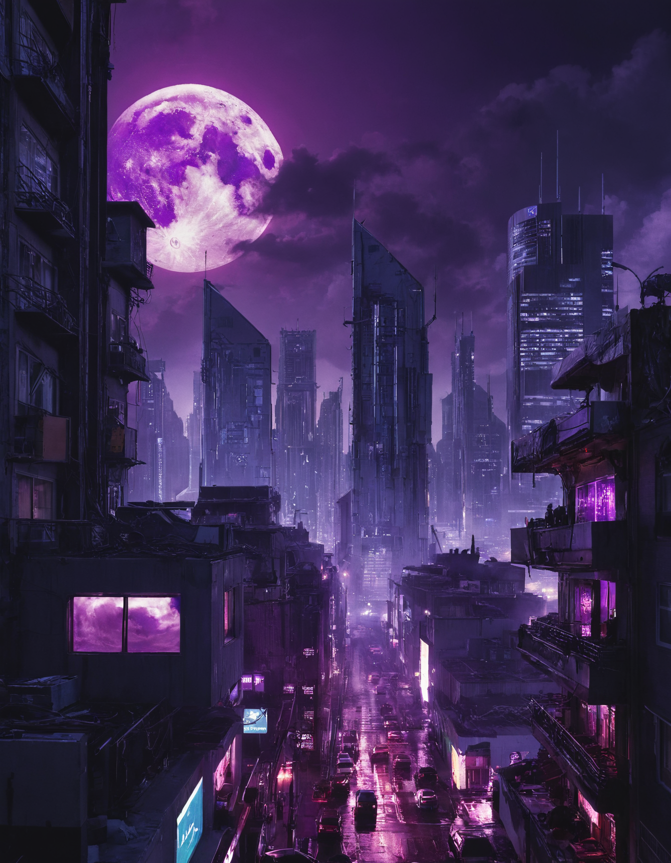 <lora:r0k00g00th:1>,r0k00g00th,r0kur3&l1tyHD. cyberpunk art,, a city with a lot of buildings and a purple moon in the sky above it is a cityscape with a lot of buildings and a lot of lights [2], prompt . ,weather, (extreme weather, Heatwaves:1.5) (prolonged extreme heat),
