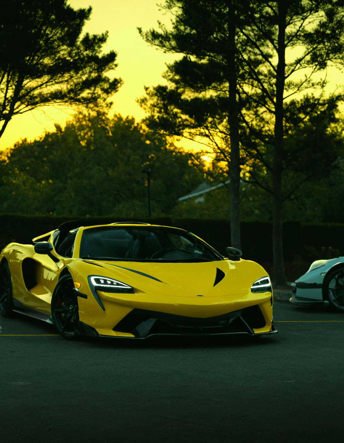 <lora:R0k00M0t0rV3h1c13HD:1>,r0k00m0t0rv3h1c13hd,r0k00bstr0cthd,car,super car,sports car,, two cars parked in a parking lot next to each other with trees in the background and a yellow light shining on the car [2]