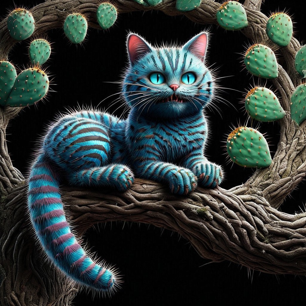 Cheshire cat, high quality, blue eyes, blue aura, sitting in a tree, dark background <lora:Prickly Pear Style v1:1>, Prickly Pear Style,