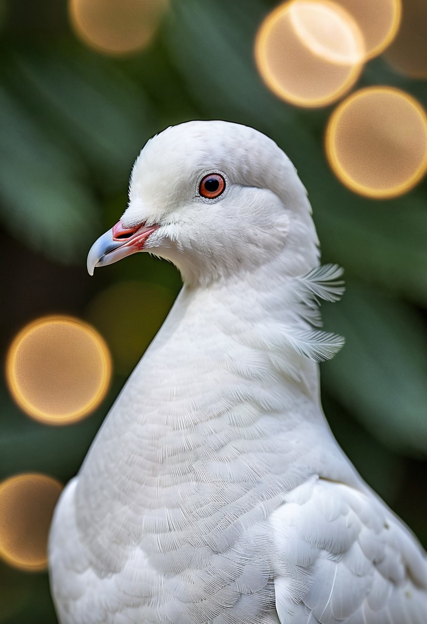 portrait, masterpiece, 4k, ray tracing, intricate details, highly detailed, hyper realistic, 8k RAW editorial photo. an adorable white dove, head with a tilt and a slight blink. The dove is feathers should be soft and fluffy, the background should be a forest, dramatic light, shallow depth of field, high budget,