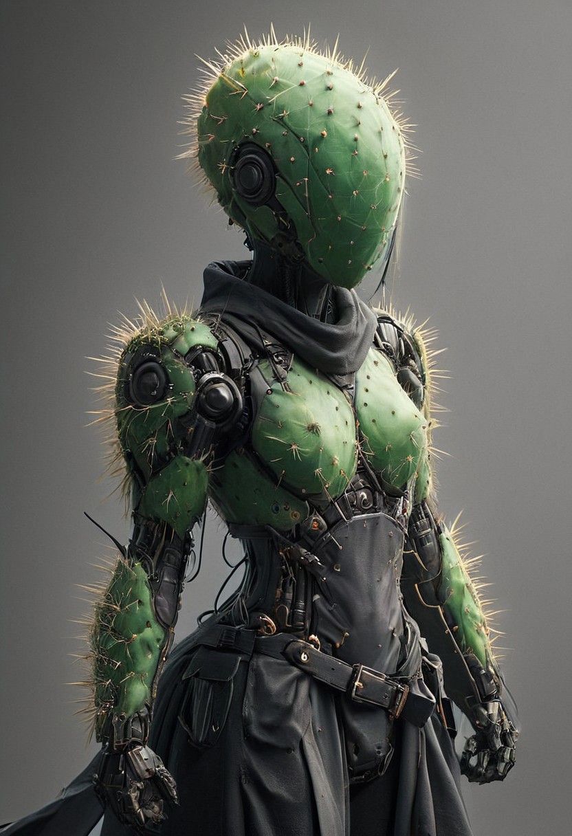 tech <lora:Prickly Pear Style v1:1>, Prickly Pear Style,, Craft a captivating vibrant dark black-neon caption for a photo capturing the essence of a cyborg Bedouin sorcerer in fight stance, defying expectations by conjuring a whimsical robot 'freak' from an oversized sedge hat. ethereal, smoky backdrop. throwing a translucent orange/tanslucent purple/black iaidow, weapon, katana, holding sword, ready to draw, sheathed, unsheathing, scabbard,, very detailed, atmospheric haze, Film grain, cinematic film still, shallow depth of field, highly detailed, high budget, cinemascope, moody, epic, OverallDetail, gorgeous, 2000s vintage RAW photo, photorealistic, candid camera, color graded cinematic, eye catchlights, atmospheric lighting, skin pores, imperfections, natural, shallow dof