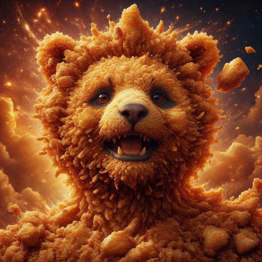 DFC, score_9, score_8_up, score_8, Masterpiece, High Details, HD, 8K, Photorealistic, perfect, High Quality, A flying fairy made of deep fried & crispy breading with the face of a panda. Within a magic World