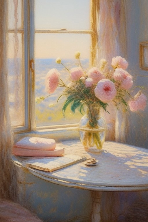 oil painting a small vase of pink peonies on the table, an open book and a white pen beside it. Pastel-colored macarons. On top, a pink mug for coffee or tea, and a bottle of perfume on the table. A croissant on a plate, accompanied by milk and jam,play of light in the style of Daniel Gerhartz and John Singer Sargent.