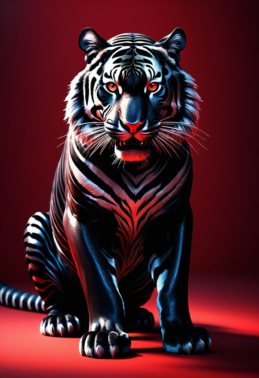 Concept Photo, A black tiger with a round head and a bright red background. The snake's body presents a smooth scale texture, and the head is also a smooth scale texture, which is very realistic, 3D Game Cinematic Feel, Epic 3D Videogame Graphics, Intricately Detailed, 8K Resolution, Dynamic Lighting, Unreal Engine 5, CryEngine, Trending on ArtStation, HDR, 3D Masterpiece, Unity Render, Perfect Composition