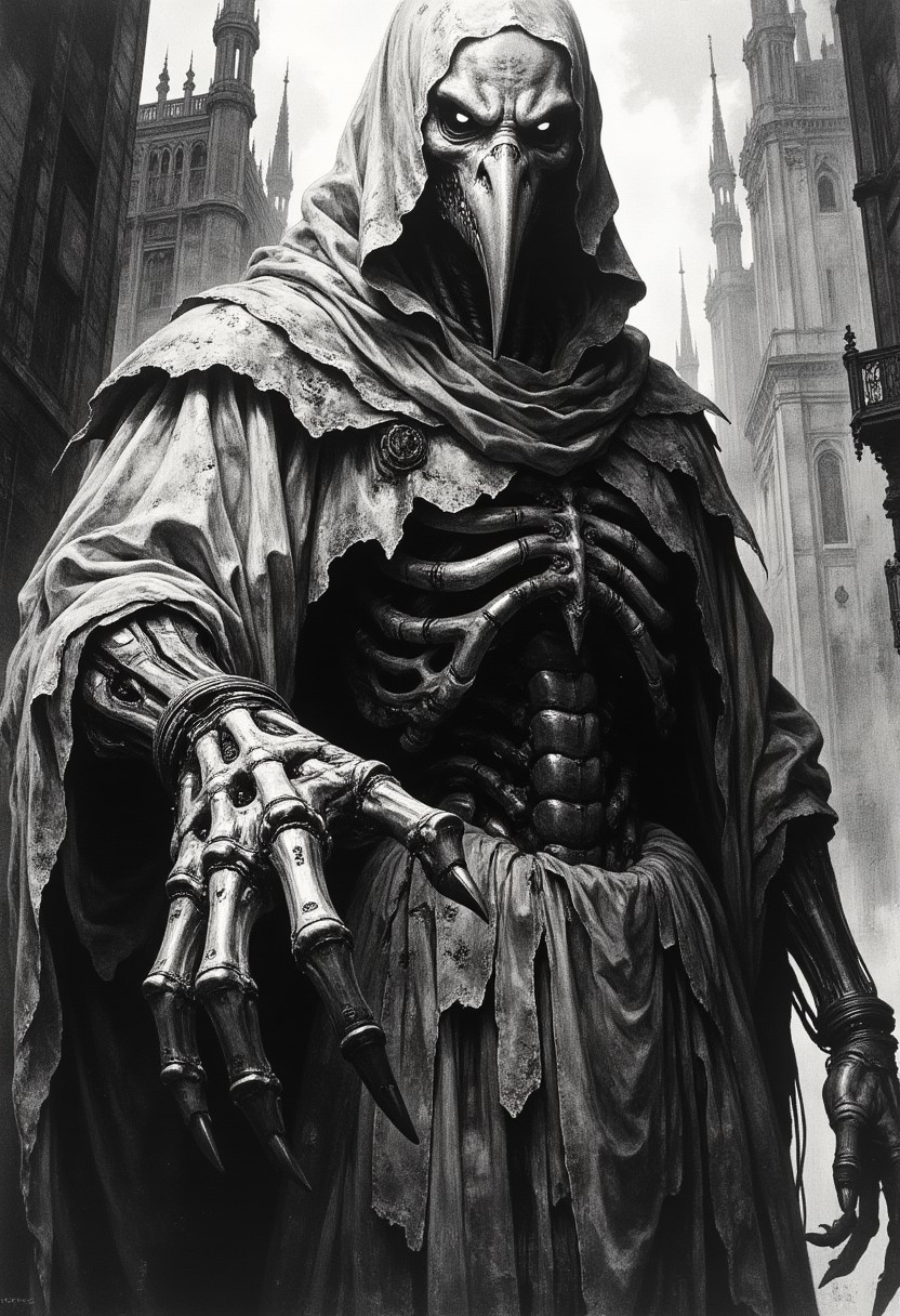 A realistic, black and white photograph of a mechanical creature. The creature in the image appears to be a towering, sinister figure with a skeletal and mechanical appearance. It has an elongated, bird-like face reminiscent of a plague doctor’s mask, complete with hollow, haunting eyes. Its body is draped in a tattered, hooded cloak with sharp, jagged edges, giving it a ghostly, nightmarish presence. The creature's limbs are long and clawed, with one hand reaching menacingly forward, featuring elongated, bony fingers tipped with razor-sharp talons. The patchwork nature of its body suggests a fusion of organic and mechanical elements, with exposed stitches, bolts, and metal plating reinforcing its eerie, stitched-together design. Its posture and stance suggest an overwhelming, almost spectral menace, looming over the viewer. The dark, gothic cityscape in the background further enhances the horror-fantasy atmosphere of the scene.