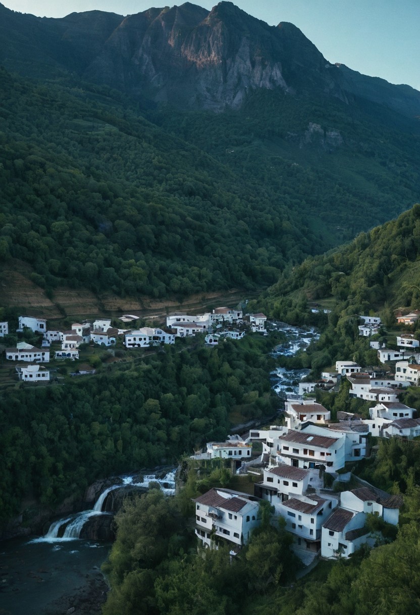 A panoramic view of utea village in the mountains with a waterfall cascading down, landscape view and natural lighting from inside city. A serene scene, surrounded by beautiful white houses built into cliffhangers, creating an inviting ambiance among the peaks while a forest at twilight casts long shadows on their backdrop reflecting off the crystal clear mountain scenery below as we gather, Film grain, cinematic film still, highly detailed, highly contrasted, dynamic pose, high budget, sharp focus, cinemascope, gorgeous, 2000s vintage RAW photo, photorealistic, color graded cinematic, natural, extreme quality
