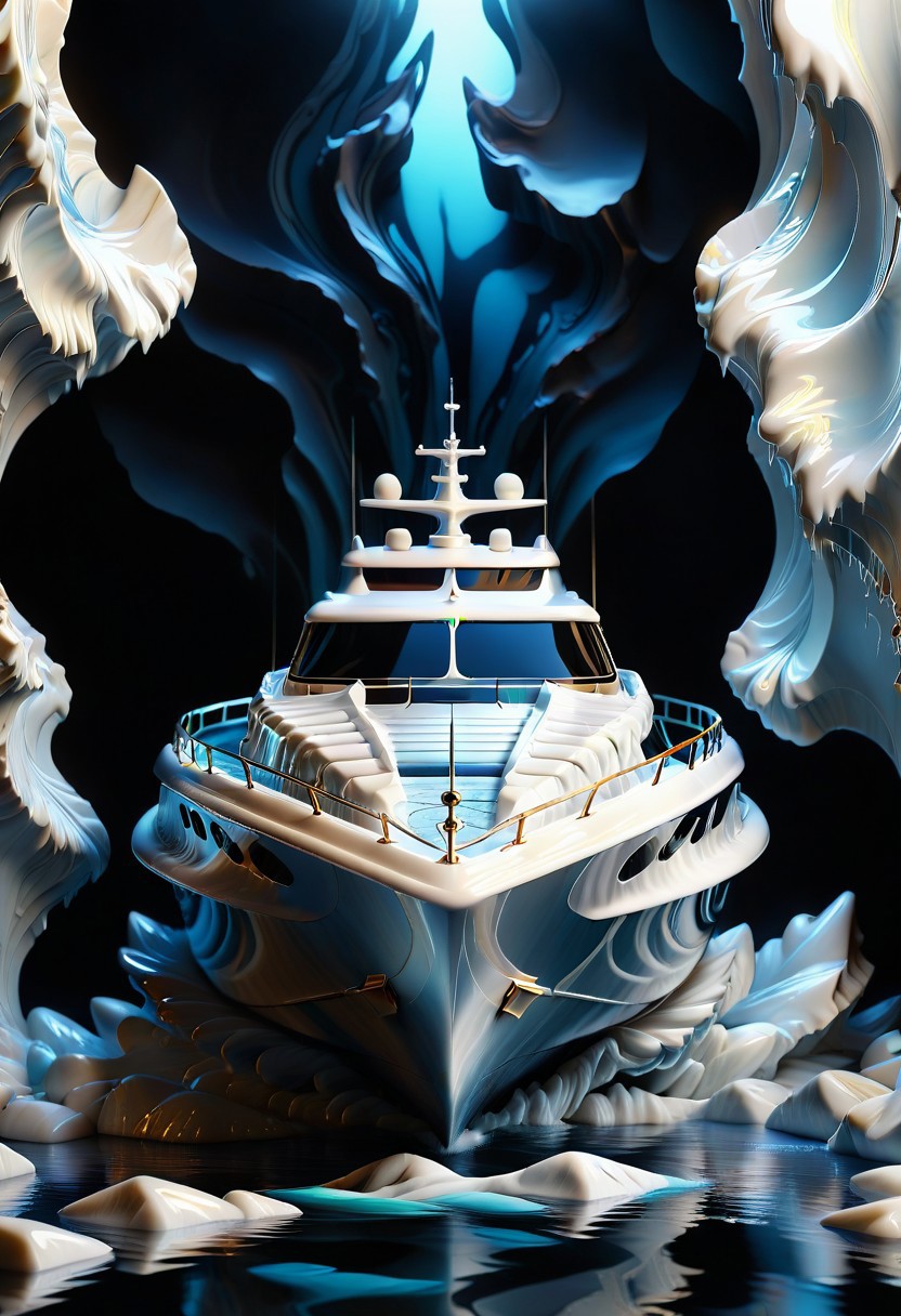 Ultrarealistic. sharp focus, dynamic lighting. play of light, Raytracing, Ultra detailed. (((Liquid Marble style))). A boat made of Liquid Marble.
