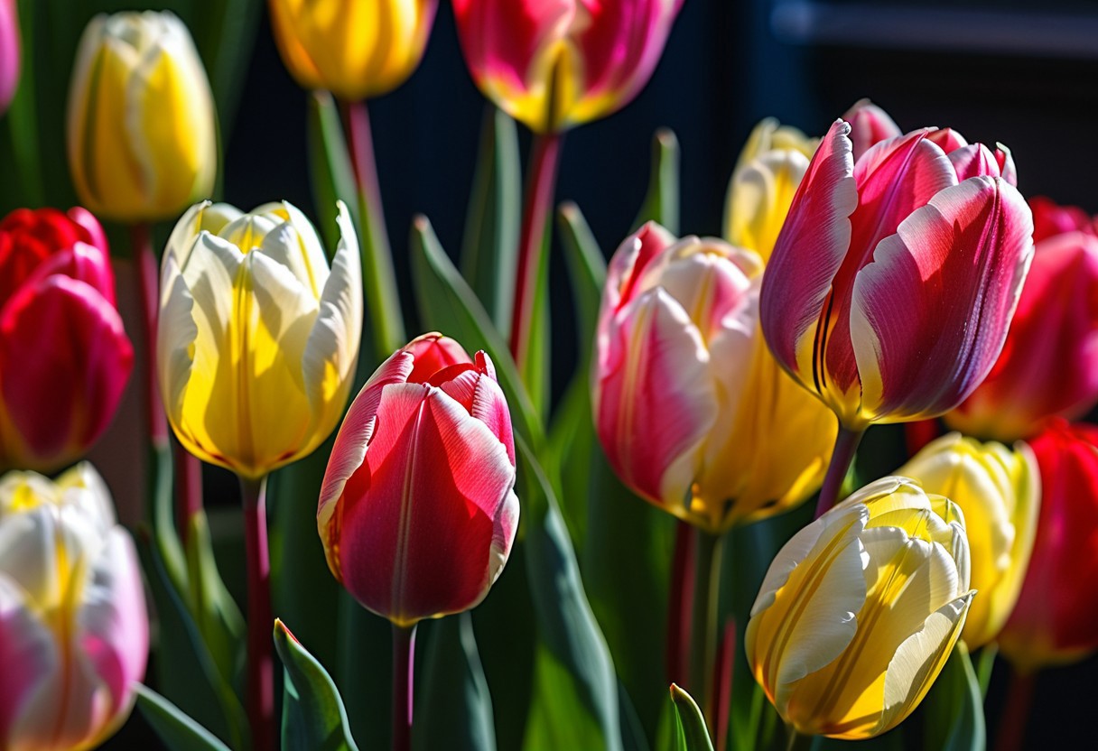 macro photo, close-up, masterpiece, 4k, ray tracing, intricate details, highly detailed, hyper realistic, 8k RAW editorial photo. red, pink, yellow, blue, white tulips,lit by the sun, dramatic light, shallow depth of field,