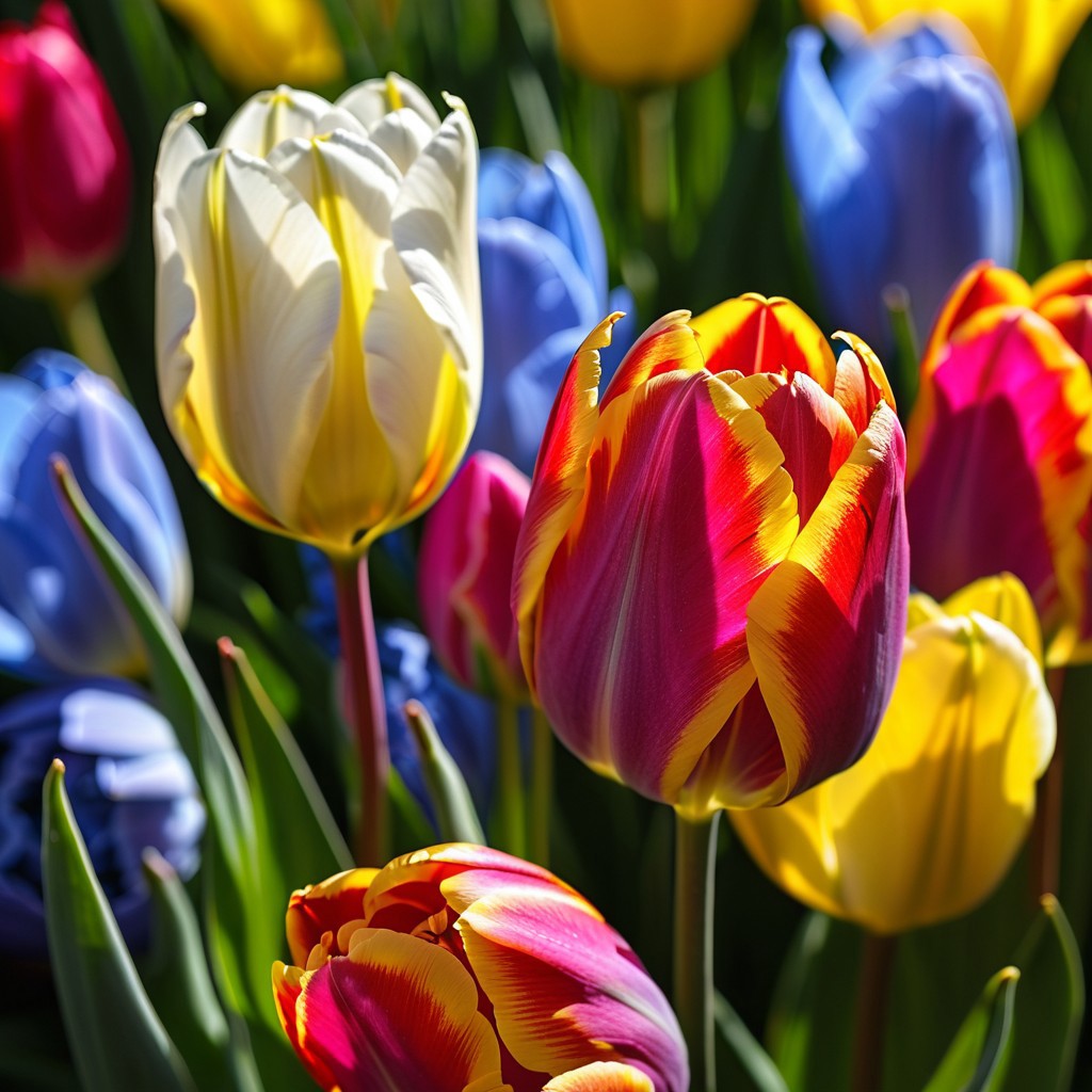 macro photo, close-up, masterpiece, 4k, ray tracing, intricate details, highly detailed, hyper realistic, 8k RAW editorial photo. red, pink, yellow, blue, white tulips,lit by the sun, dramatic light, shallow depth of field,
