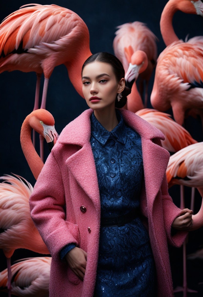 cinematic photo of a woman with a pink feather coat hugging a group of elegant pink flamingos in a black studio background, surrealism, coat designed by Balenciaga, nostaligic mood, dark blue, rembrandt lighting, blue and warm lights, shot with Hasselblad X1D, A cinematic, hyper-detailed, National Geographic-style composition, shot with a Canon EOS R5, f/1.4 aperture, soft bokeh background, 8K resolution, photorealistic,
