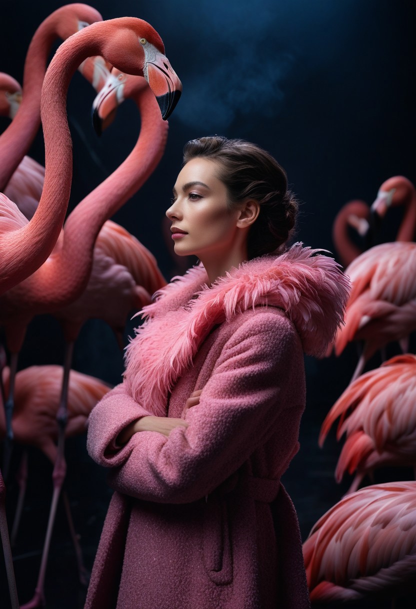 cinematic photo of a woman with a pink feather coat hugging a group of elegant pink flamingos in a black studio background, surrealism, coat designed by Balenciaga, nostaligic mood, dark blue, rembrandt lighting, blue and warm lights, shot with Hasselblad X1D, A cinematic, hyper-detailed, National Geographic-style composition, shot with a Canon EOS R5, f/1.4 aperture, soft bokeh background, 8K resolution, photorealistic,