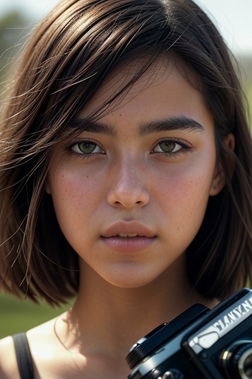 The monochrome image portrays a big breasts Caucasian young woman with short, dark hair holding a vintage camera close to her face, partially obscuring one of her eyes. She gazes directly into the lens with an intense, thoughtful expression. The photograph has a distinct cinematic and nostalgic aesthetic, with soft lighting, a grainy texture, and subtle color grading that gives it a vintage, film-like quality. Subject and Composition The subject's face is positioned slightly off-center, drawing immediate attention to her sharp and expressive features. Her dark, well-defined eyebrows frame her deep-set eyes, which are slightly shadowed, adding to the introspective mood of the image. Her lips, which are slightly parted and tinted a natural red, contrast subtly with her smooth, pale skin. Strands of hair fall loosely across her face, reinforcing the unposed, organic nature of the portrait. full body, Ultra High Definition, Impeccable Detail, Premier Quality, Best-in-class, (Photorealistic), (Lifelike), Top quality, score_9, score_8_up, score_7_up, score_6_up, score_5_up, score_4_up, (perfect anatomy), Smooth Anime Night, Expressiveh, realistic skin, detailed skin, detailed skin pore, skin texture style, amateur, raw photo,