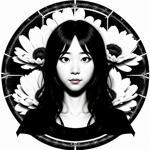 (ttatt:1.1), a girl with half face on flowers, dark style, bw, chrome, masterpiece, dynamic forms