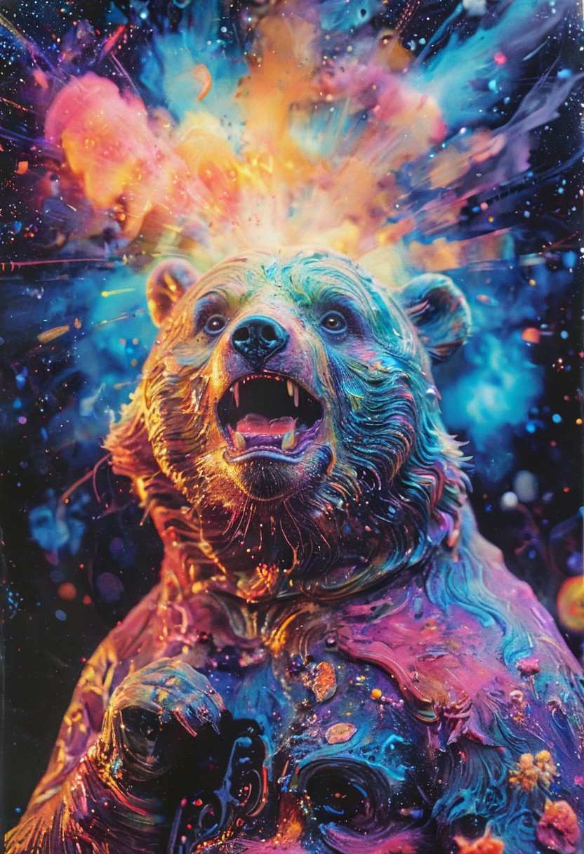 Product photograph, the 1980s, PsychadelicChaos, the universe, chaos, insane colors, the universe blowing up, insane colors, a universal bear, blue lighting, beautiful, epic, analog film grain, polaroid, DSLR