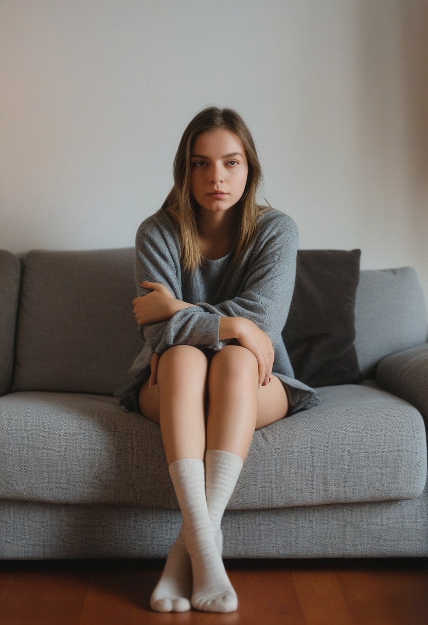 1girl,sitting on a cozy couch,crossing legs,soft light