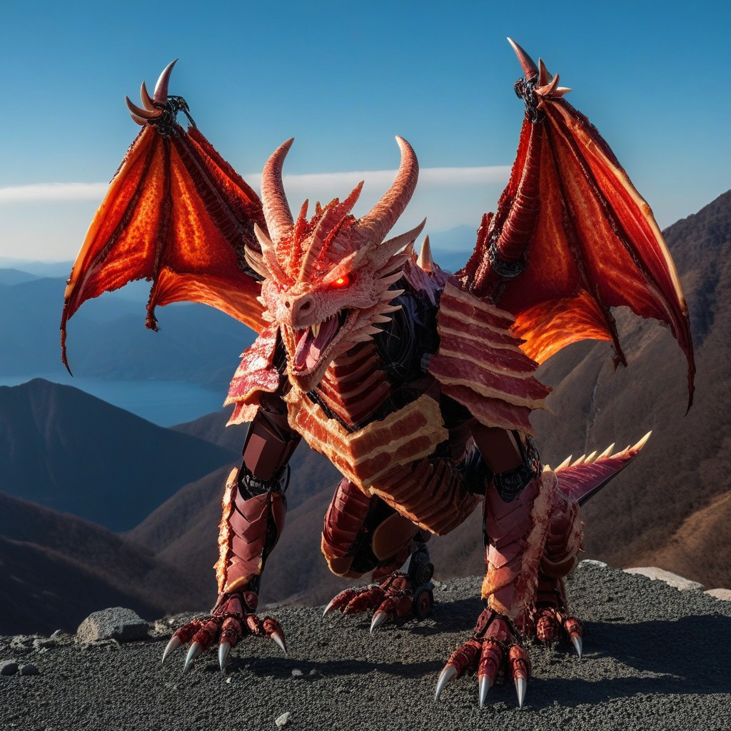 codeandigital, c0dean0igital, cyberw0rlds, no humans, dragon made out of bacon, mountain background, mountain made out of bacon, wings made out of bacon, claws, solo, open mouth, tail, red eyes, sharp teeth, teeth, monster, robot, full body, non-humanoid robot, horns, mecha, flying, tongue, from side, creature, fangs, science fiction, glowing, spikes, bacon scales, red gem, looking at viewer, armor made out of bacon, Tokio streets background, Tokio, mountain, Fuji, wearing glasses, glasses made out of bacon