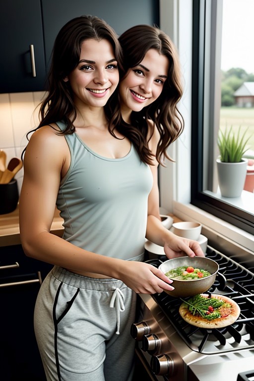 Realistic full body photo of a beautiful 4nn4k-v1 woman, 2girls, two headed, conjoined, conjoined dicephalus, wearing a tank top and athletic pants, solo, long hair, wavy hair, dark brown hair, caucasian, smiling, realistic, in a kitchen, holding a pot and a spoon, soft, cooking a meal on a stovetop, Photorealistic, detailed, RAW, analog, sharp focus, 8k, HD, DSLR, high quality, Fujifilm XT3, award winning, masterpiece<lora:4nn4k-v1:1.0> <lora:4nn4k-v1:1.0><lora:4nn4k-v1:1.0>