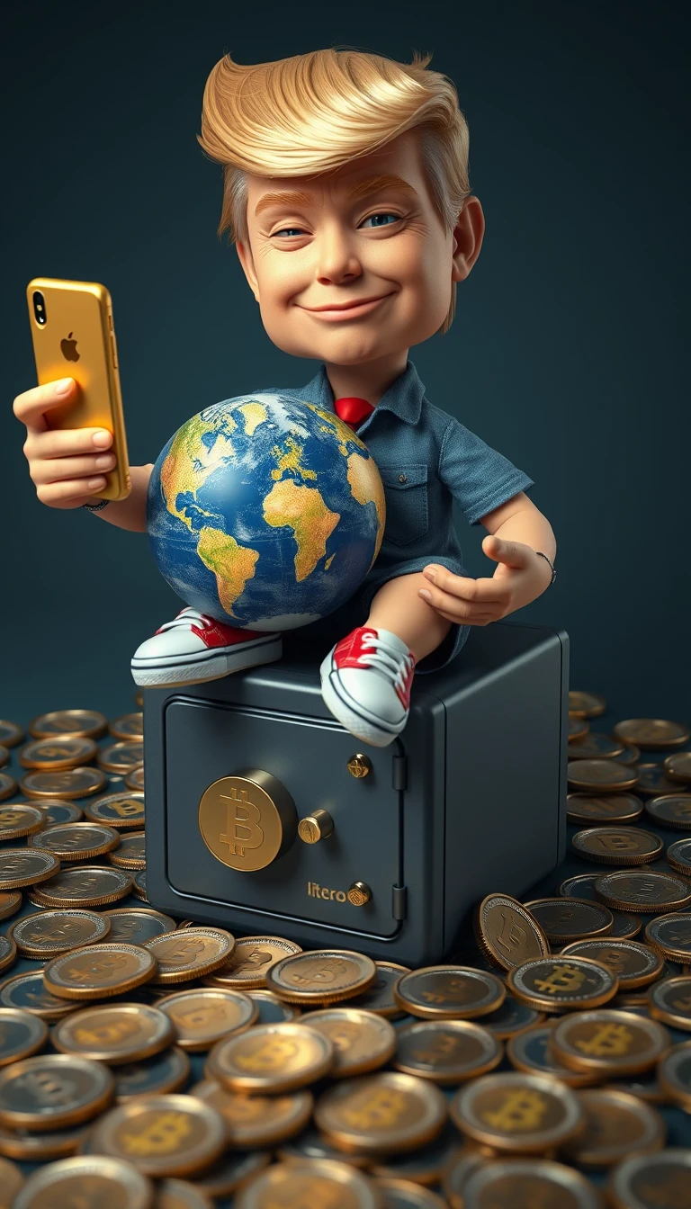 A mini-clone, the real-life "Barron Trump", with a flattering appearance and a sarcastic smile at the corner of his mouth, attentive eyes, and a piercing in his ear. He holds the globe of the Earth in his right hand and with his left hand takes a selfie with a golden iPhone. He is sitting on top of a mini safe with the Bitcoin logo. Thousands of "Ethereum and BTC" coins are scattered on the floor. He is looking at the camera, winking with his left eye. He is wearing Converse sneakers and shorts. Highly defined 3D image.