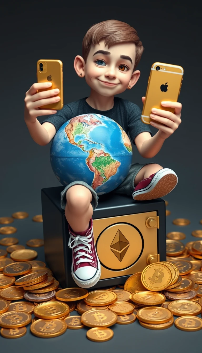 A mini-clone, the real-life identical to "Vitalik Buterin", with a flattering appearance and a sarcastic smile at the corner of his mouth, attentive eyes and a piercing in his ear. He holds the globe of the Earth in his right hand and with his left hand takes a selfie with a golden iPhone. He is sitting on top of a mini safe with the "Ethereum" logo. Thousands of "Etherium and BTC" coins are scattered on the floor. He is looking at the camera, winking with his left eye. He is wearing Converse sneakers and shorts. Highly defined 3D image.