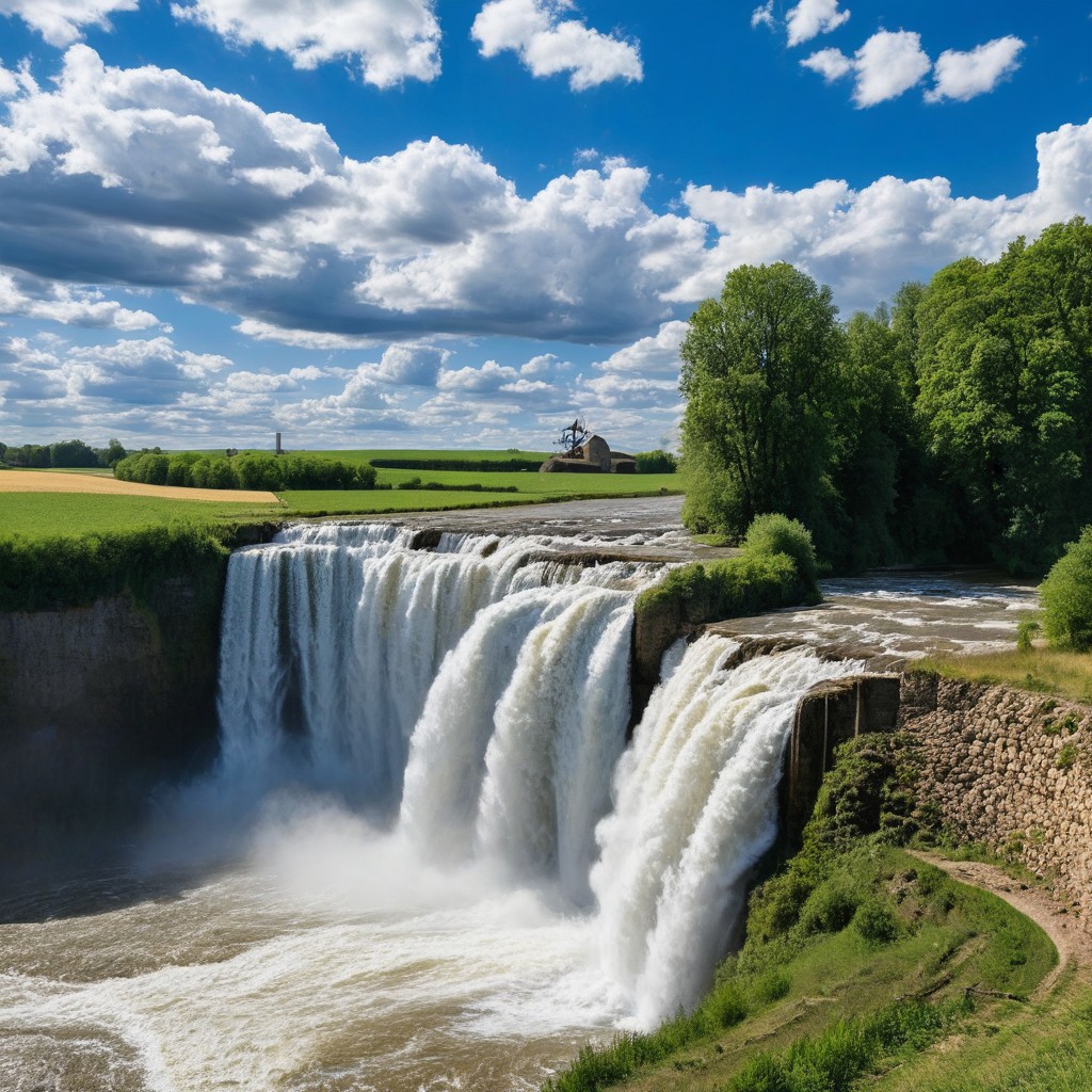 Flour mills powered by the grinding wheel rotating by the force of water with the waterfall activating it, strong river and waterfall near the mill, background large wheat fields and blue sky with cumulus clouds