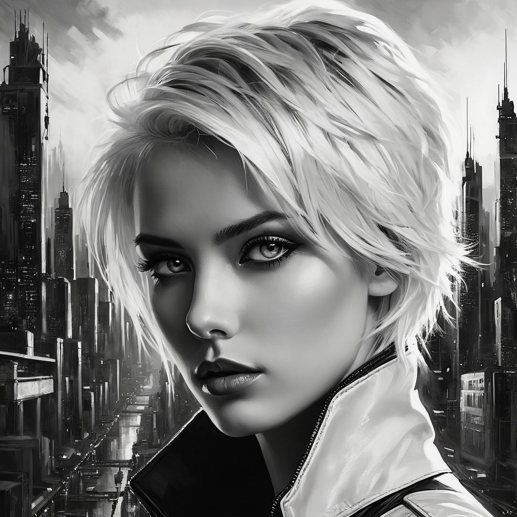 A striking portrait of a beautiful woman with short, tousled platinum blonde hair, intense eyes, and sharp facial features. The artwork is in a semi-realistic, high-detail black-and-white style with a cyberpunk and futuristic aesthetic. The background features a surreal cityscape, blending into her figure with an abstract, painterly effect. One side of the city is dark and shadowy, while the other side is illuminated by a glowing, golden sunset, reflecting off the water. The composition is dynamic, with a mix of fine details and expressive brushstrokes, creating a dreamlike and cinematic atmosphere.