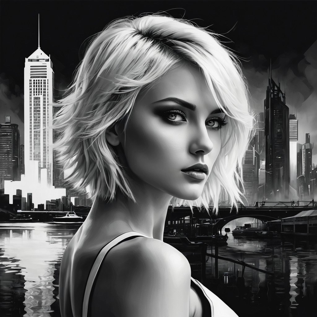 A striking portrait of a beautiful woman with short, tousled platinum blonde hair, intense eyes, and sharp facial features. The artwork is in a semi-realistic, high-detail black-and-white style with a cyberpunk and futuristic aesthetic. The background features a surreal cityscape, blending into her figure with an abstract, painterly effect. One side of the city is dark and shadowy, while the other side is illuminated by a glowing, golden sunset, reflecting off the water. The composition is dynamic, with a mix of fine details and expressive brushstrokes, creating a dreamlike and cinematic atmosphere.