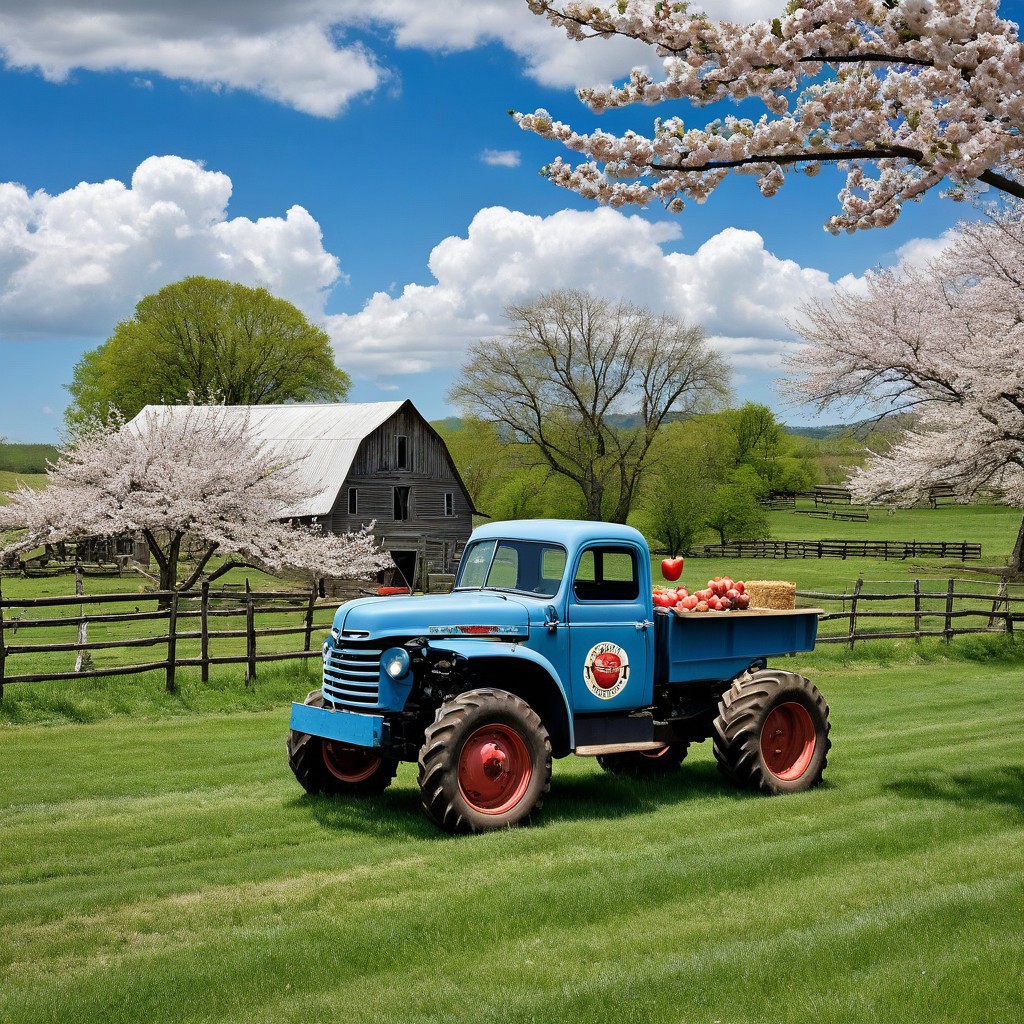 Antique farm and antique house, cows in a fenced field, large vegetable garden, antique 1950 McCormick tractor, 1951 Ford truck, apple and cherry blossoms in the background, blue sky with cumulus clouds, photography very realist