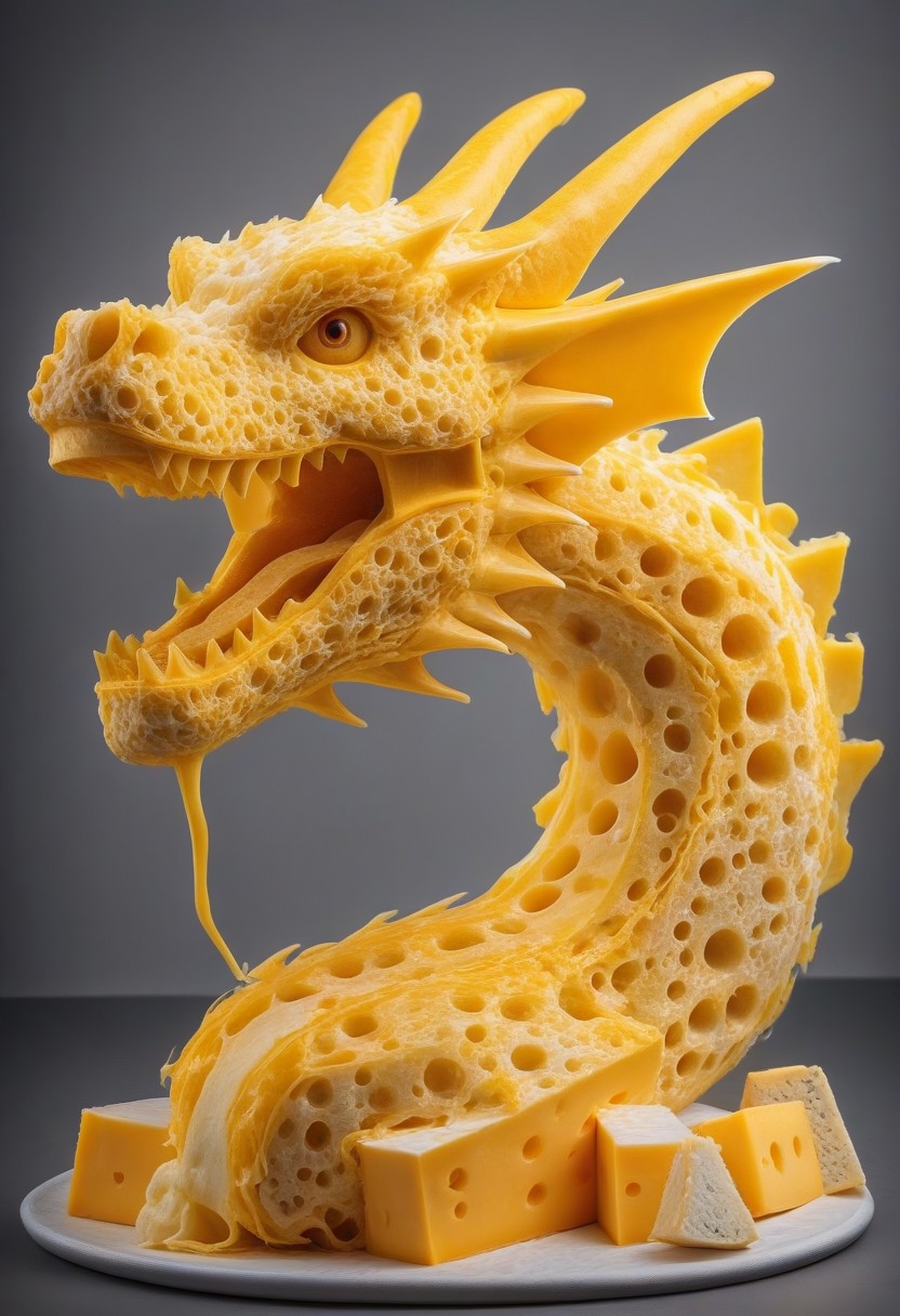 (best quality, masterpiece, high resolution:0.5), dragon made of cheese,