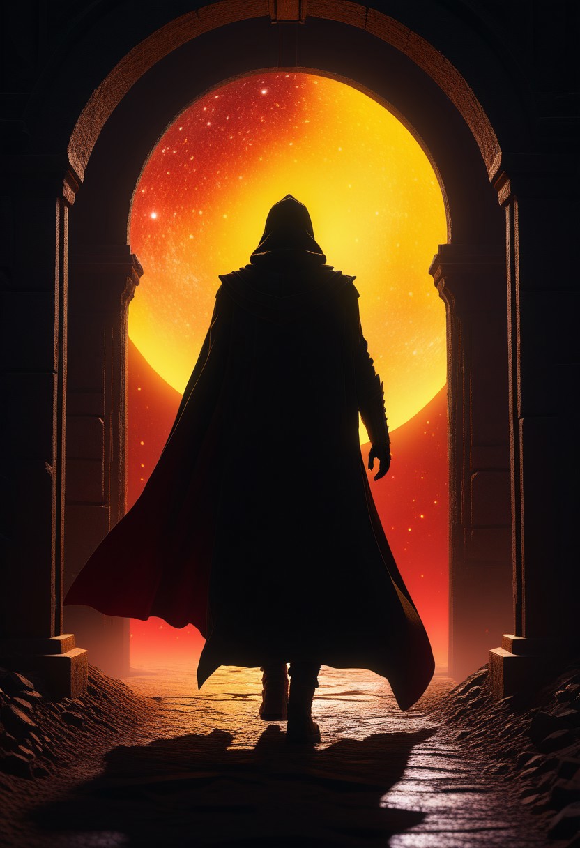 a silhoutte of a entity in cloak walking in a narrow split gate , a yellow and red beam of light coming from narrow split, dusty , splash art , nebula effect , stars . yellow red and black hues, 2020, low poly, isometric art, 3d art, high detail, artstation, concept art, behance, ray tracing, smooth, sharp focus, ethereal lighting, Drew Stuzan, highly detailed, Epic 3D Videogame Graphics, Intricately Detailed, 8K Resolution, Dynamic Lighting, Unreal Engine 5, CryEngine, Trending on ArtStation, HDR, 3D Masterpiece, Unity Render, Perfect Composition