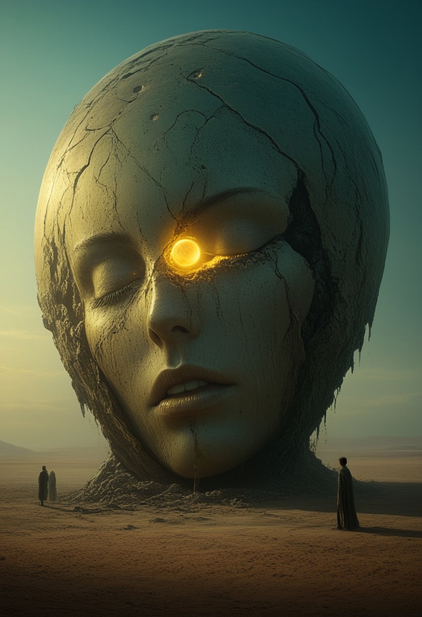 Epic scene, Giant buried in the desert, people watching, shocking, ultra-realistic, art leans heavily towards surrealism, with its dreamlike quality and the blending of reality with the fantastical. The melting face and glowing orb invoke a sense of the uncanny, common in surrealist works, by Beeple and Wojtek Fus and Aeforia, movie poster, extremely detailed, hyper resolution, cinematic lighting