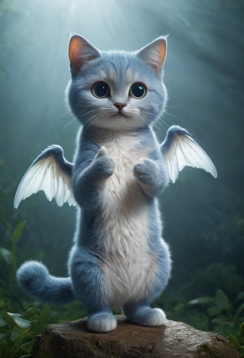 Envision a whimsical fantasy world where a cute big blue cat with white wings takes center stage, standing on its hind legs, happy face. Picture the carnivores with a mischievous charm, its translucent big eyes reflecting a soft glow. Thumb Up Pose, holding a fish, very detailed, hd, RAW photograph, masterpiece, top quality, best quality, official art,highest detailed, atmospheric lighting, cinematic composition,