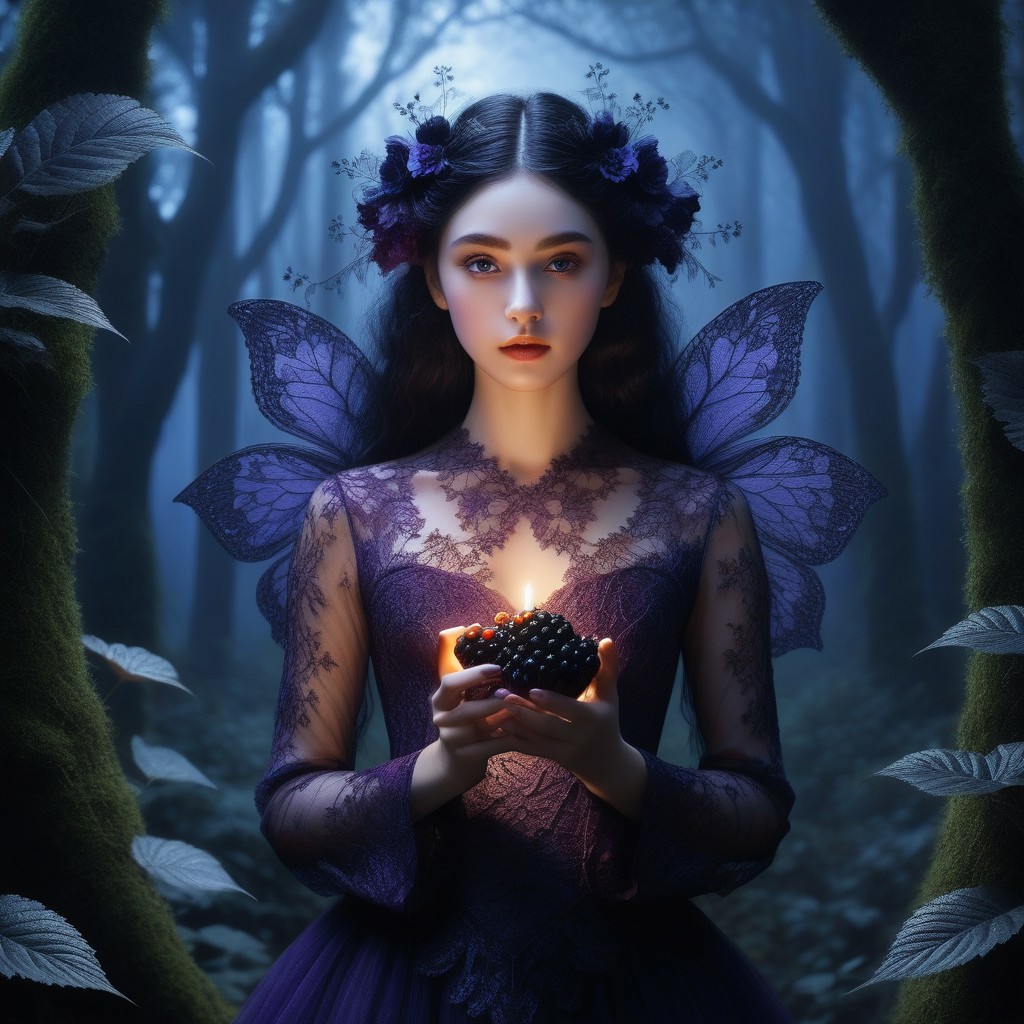 Rating:safe, (best quality:1.4), masterpiece, extremely detailed, CG 8K wallpaper, sharp focus. In a dimly lit, mystical forest, a dark fairy made of lava stands out against the shadows, her deep violet hair and eyes drawing attention like a siren's call. She grasps a magical blackberry that emits a gentle, ethereal glow. The midnight silk dress she wears features intricate fractal patterns inspired by the clustered shape of blackberries, adding an air of mystery to her enigmatic presence. Soft, moody lighting wraps around her, casting long shadows and highlighting the delicate curves of her face as she holds the glowing fruit.