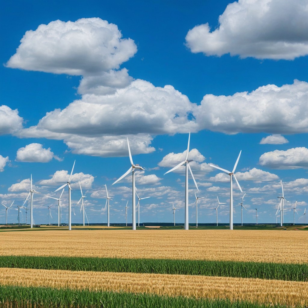 Windmills with 4 grinding blades rotating by the force of the wind activating it, background large wheat fields and blue sky with cumulus clouds