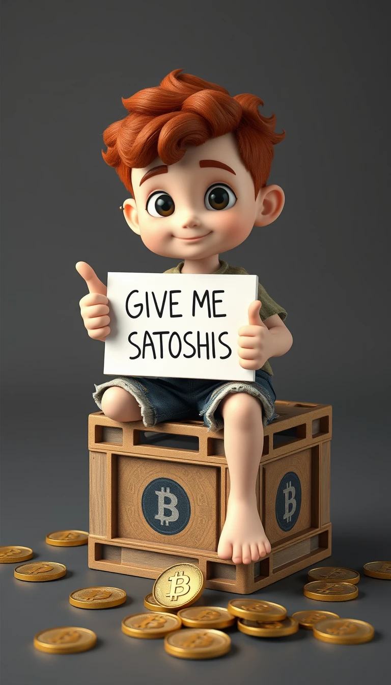 A mini-clone, "very similar to the real-life Vitalik Buterin", with a flattering appearance and curly red hair, he does not smile but has attentive eyes and a piercing in his ear. In his right hand, he holds a sign that says "GIVE ME SATOSHIS", and with his left hand he gives a thumbs up. He is sitting on top of a crate with the logo "BTC" on it. Some broken and cracked "BTC" coins are scattered on the floor. He is looking at the camera, he is wearing worn and torn shorts, a worn t-shirt printed with small BTC logos, and has simple flip-flops on his feet. Highly defined 3D image.