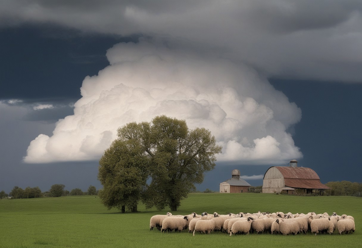Cumulo-nimbus storm cloud landscape, close-up flocks of grazing sheep, antique wooden farmhouse with antique grain silo, photographie très réaliste