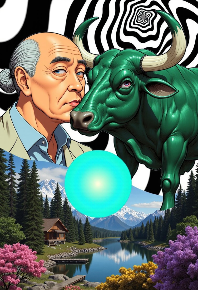 (niji, gothic, erotic, anime, trippy, collage, surreal, khanette) A surreal, collage-style artwork featuring an elderly Japanese man with male pattern stage 4 baldness, his remaining silver hair tied into a low man bun. His weathered face, filled with wisdom, is juxtaposed against a large, green-painted bull, its deep emerald hue contrasting sharply with the man's soft, serene expression. The bull's face is close to the man’s, its large, curved horns extending outward in striking, fragmented angles. The image combines elements of digital painting, anime aesthetics, and photographic textures, creating a trippy, layered effect. In the background, a warped black-and-white striped pattern is tangled with sharp, geometric spirals, offering an optical illusion of movement. A glowing turquoise sphere floats in the center, resembling a moon, radiating soft light around it. The lower portion of the collage is a fragmented scene—a serene lake reflecting snow-capped mountains, bordered by deep green foliage and surreal pink and yellow flowers. A wooden dock leads to a secluded cabin on the left, while on the right, a dark forest tinged with purple and pink hues seems to pulse with hidden life. The surreal, multi-layered composition creates a disjointed yet harmonious atmosphere, with intricate textures and shadows highlighting the connection between the man and the bull, drawing the viewer into a trance-like, dreamlike experience.