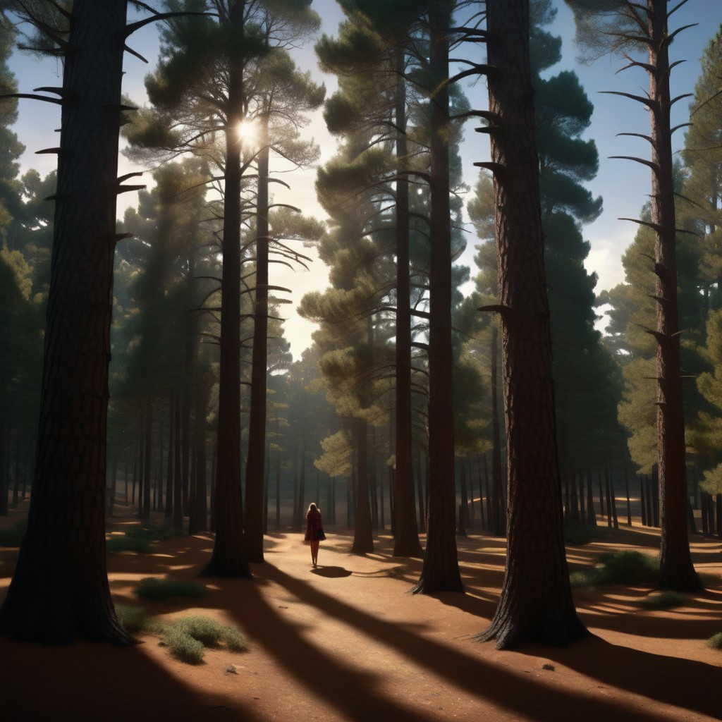 Rating:safe, (best quality:1.4), masterpiece, extremely detailed, CG 8K wallpaper, sharp focus. A (((hyper-realistic (((full body portrait))) bathed in (intense shadows))), featuring a ((Ponderosa Pine Forest))) with intricate ((twisting and contorted trees)), under a (subtle gray and brown twilight sky) dotted with (sharp, detailed foliage), a winding path that leads into the distance, (Ultra Detailed, High Definition, 8K resolution). The scene exudes an air of (serenity and wonder) that invites (immersive exploration) in a (vast, natural landscape). The lighting provides (deep shadows) that contrast beautifully with the (softly glowing, twilight trees) and (twilight blue sky). This is a truly (hyper-realistic masterpiece) that transports the viewer to a dreamlike realm where the ordinary becomes truly unforgettable. ((depth of field 100mm lens)) High Resolution, High Contrast, Ultra Detailed.
