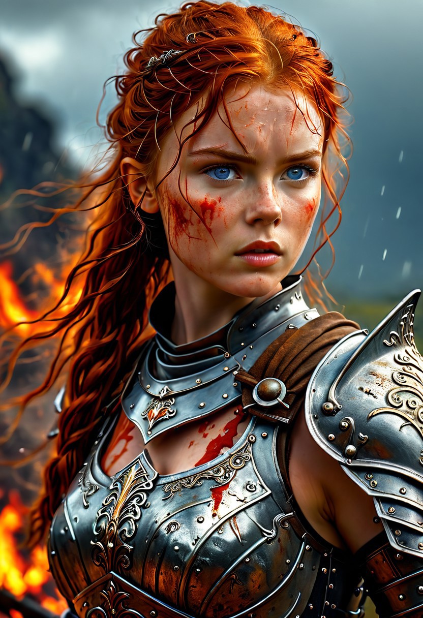 High resolution ultra-realistic of Beautiful burly Warrior girl, 8k, capturing the intensity of the moment, cinematic lighting, standing on a bloody and stormy Battleground in a fighting pose, wavy red hair, realistic bloody dirty pale face, realistic blue eyes, fire, intricately designed iron and silver medieval armor, brown mini skirt, LOTR Aesthetic, perfect athletic figure, beautiful Sadie Sink as Warrior girl, fire, ultra realistic, cinematic style, athletic figure, dark fantasy, dramatic lighting, wet and sweaty skin, dirty skin, athletic figure, dark medieval, dramatic lighting, Greg Rutkowski style,, Warrior girl on in iron armor, hyper-detailed, hyper-realistic, bright colours, Attractive 25 old years girl, Attractive, beautiful firm Breasts, sharp focus, digital painting, Photograph Taken on Nikon D750, Alphonse Mucha, 8K, athletic figure, Hyperdetailed, hyperrealism, Attractive, Attractive bust girl, asymmetric balance