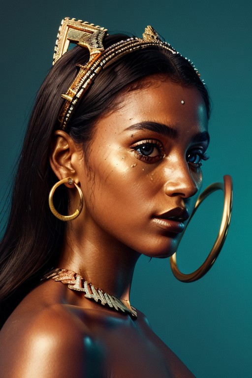 Imagine a hyper-detailed portrait of a woman with azure red skin, her face decorated with gold tribal patterns that swirl and curve around her eyes, cheeks, and neck. The golden motifs are complex, with lines, dots, and spirals that add texture and depth to her visage. Her lips are painted with a deep metallic color that harmonizes with the golden details on her skin. She wears a prominent headdress of silver, adorned with dangling ornaments that add movement and contrast to the stillness of her face. Large, elegant gold hoop earrings complement the tribal-inspired design, and her eyes are framed with dramatic golden eye shadow and long, defined lashes. The lighting is soft yet focused, highlighting the gold’s shimmer and the matte finish of her blue skin, lending a realistic touch to this ethereal composition. This photorealistic image fuses ancient cultural elements with a modern style, creating a mesmerizing effect, front view, from below,