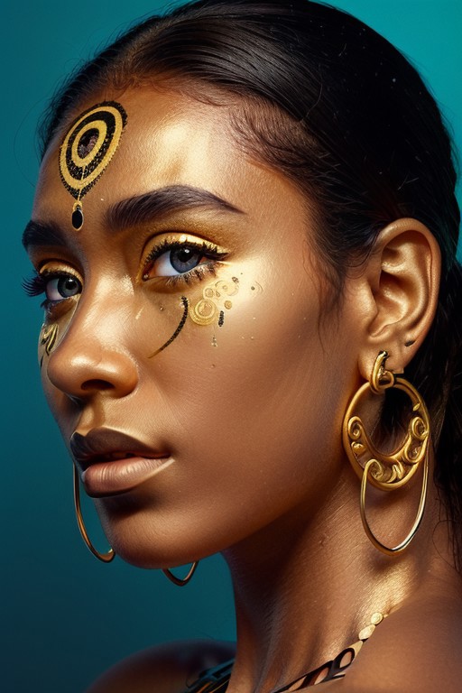 Imagine a hyper-detailed portrait of a woman with azure red skin, her face decorated with gold tribal patterns that swirl and curve around her eyes, cheeks, and neck. The golden motifs are complex, with lines, dots, and spirals that add texture and depth to her visage. Her lips are painted with a deep metallic color that harmonizes with the golden details on her skin. She wears a prominent headdress of silver, adorned with dangling ornaments that add movement and contrast to the stillness of her face. Large, elegant gold hoop earrings complement the tribal-inspired design, and her eyes are framed with dramatic golden eye shadow and long, defined lashes. The lighting is soft yet focused, highlighting the gold’s shimmer and the matte finish of her blue skin, lending a realistic touch to this ethereal composition. This photorealistic image fuses ancient cultural elements with a modern style, creating a mesmerizing effect, front view, from below,