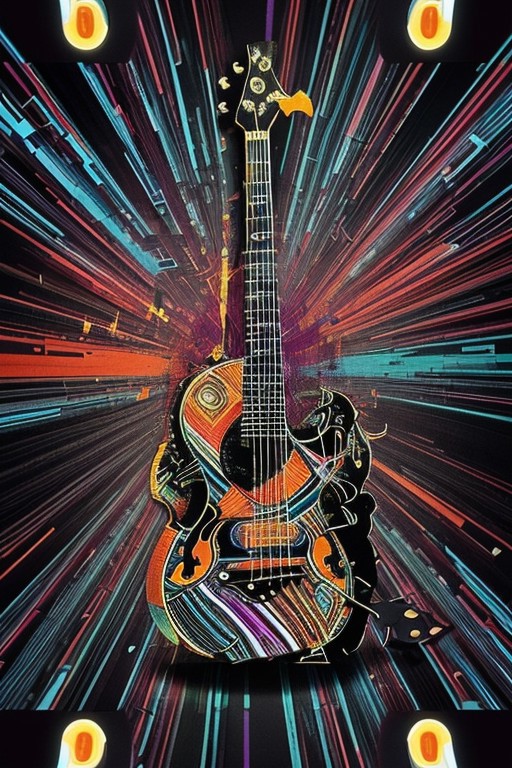Create a striking abstract collage using vibrant cutout images of musical instruments. Blend them together in an unusual way with glitch effects.