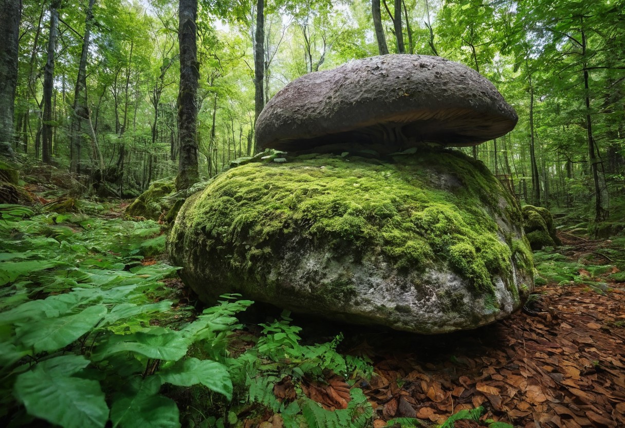 epic view very realistic photography, wide angle, a big rock in the foreground, mushrooms on this big rock, rock covered in green leaves, forest background, full frame sensor sharp and realistic colors with exceptional clarity