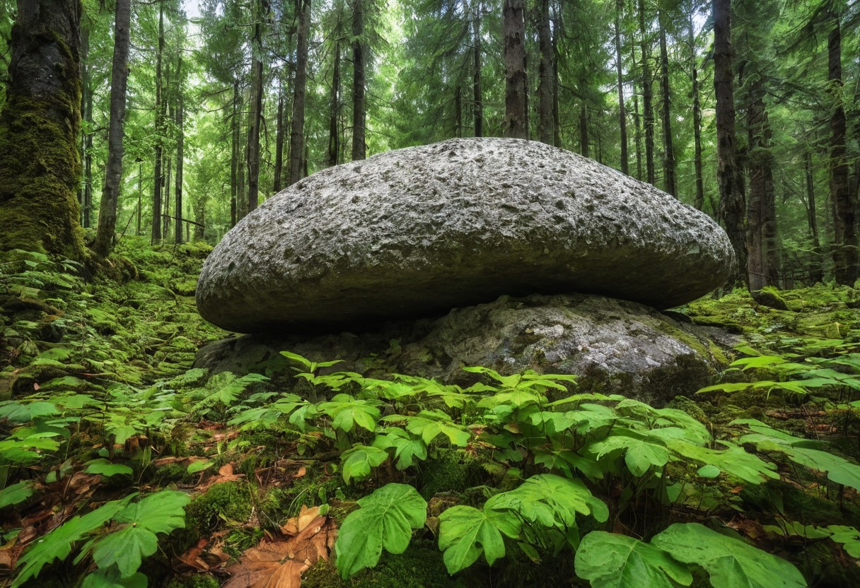 epic view very realistic photography, wide angle, a big rock in the foreground, mushrooms on this big rock, rock covered in green leaves, forest background, full frame sensor sharp and realistic colors with exceptional clarity