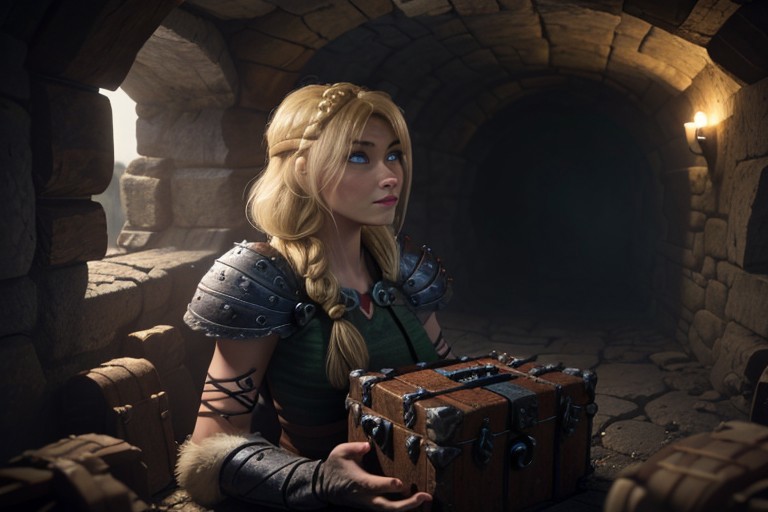 masterpiece, best quality, 1girl, <lora:Astrid_Character:1> AstridWaifu, ((exploring),, dungeon-background, dungeon, underground, skeleton, stone wall, moss, treasure chest, shadows, dramatic lighting, fantasy , 3d, 3d background, smooth edges, cgi, toon \(style\),(long hair, blonde, blue eyes, braid:1.2), (armor:1.2)