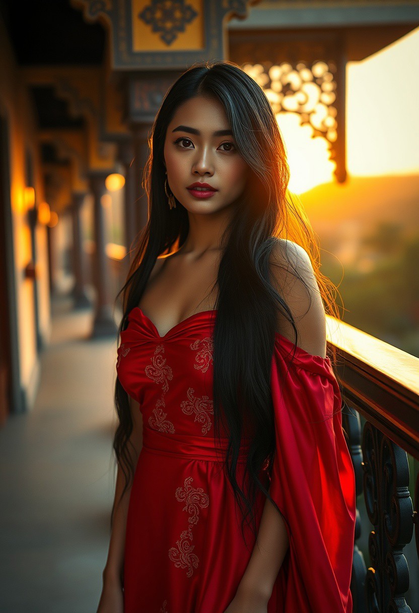 A hyperrealistic, ultra-detailed cinematic photograph of a stunning Southeast Asian woman standing by an ornate balcony, bathed in golden-hour light. Her long, raven-black hair cascades down her bare shoulders, catching the soft glow of the setting sun. She wears a flowing, off-shoulder crimson silk dress that clings to her slender figure, its delicate embroidery shimmering in the light.