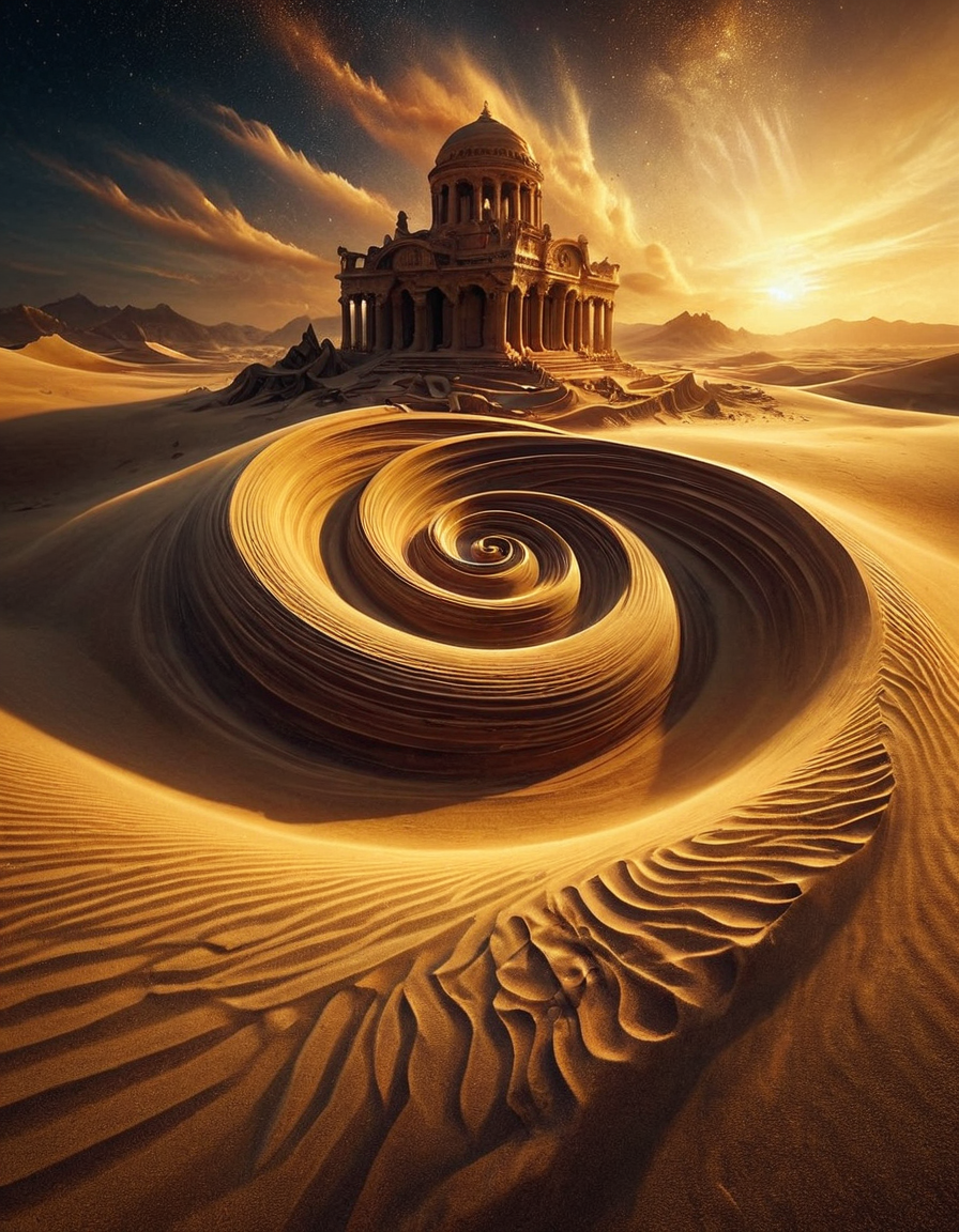 Golden hour, nebula, stardust, sandswirl, ancient ruins emerging from sand, forgotten city <lora:SandSwirlLoRa:0.8>