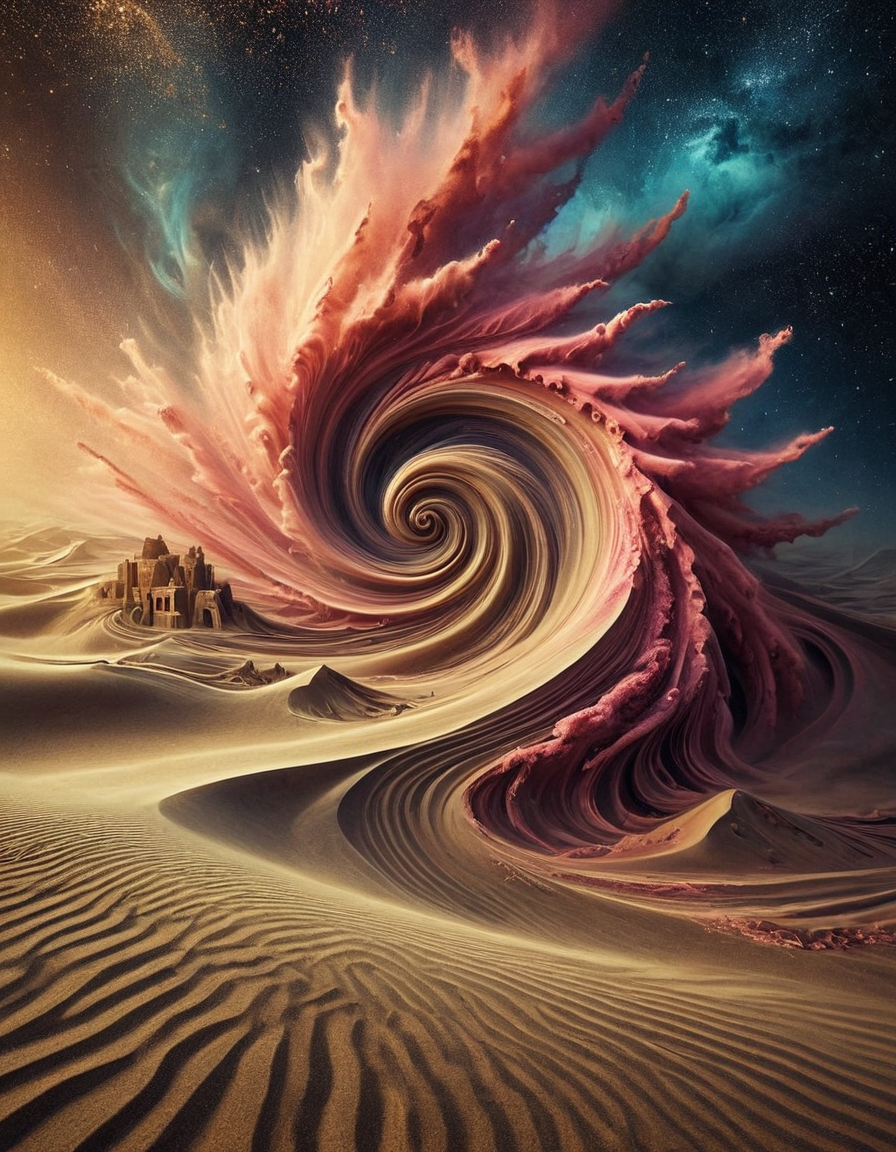 abstract swirling sand, cosmic dust, nebula, stardust, sandswirl, ancient ruins emerging from sand, forgotten city <lora:SandSwirlLoRa:0.8>