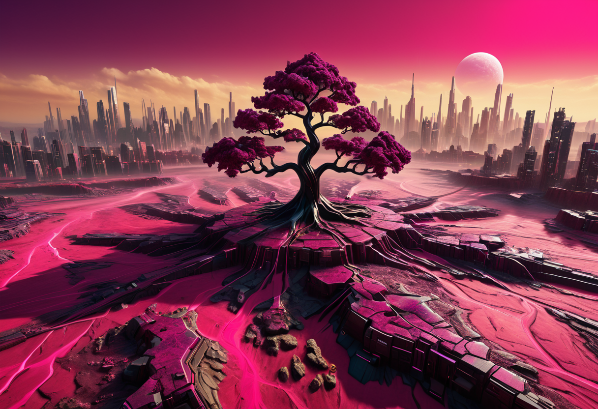 realistic, RAW photo, high quality, Stable_Yogis_PDXL_Positives, satellite photo of a huge <lora:FUTURE_SKYLINE_BY_STX:0.3>, made of <lora:INWYTK_03vb:0.1> inwytk03,<lora:Colorful_Marbled_Paper_SDXL_v2:0.0> mad-marbled-paper, colorful, in <lora:Low-key lighting Style:0.6> Low-key lighting Style,<lora:volumetric lighting style v2:0.8> volumetric lighting style, <lora:sdxl_cyberpunk:0.2> cyberpunk style,SK_Cyberpunk vast city with , in <lora:Clean_Minimalist:0.0> minimalistic, flat color, no lineart, silhouette, simple bright background, featuring <lora:Mars:1.0> m4r5, rock, sand, sky, red colors,<lora:Fractal_Fusion:0.7> serene landscape featuring a tree with detailed fractal branching patterns