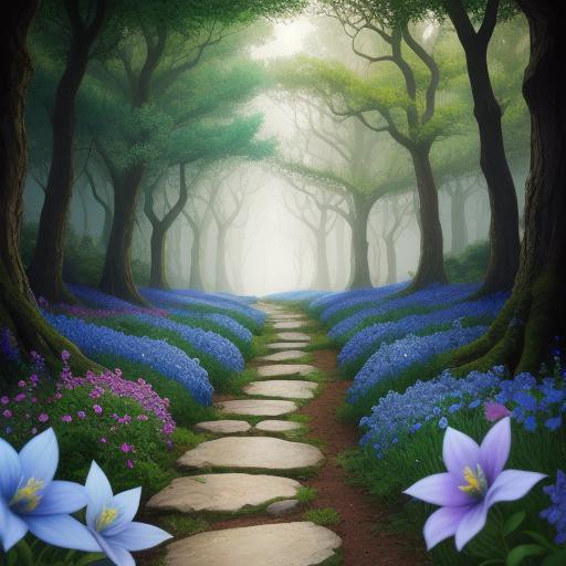 An echanted fantasy forest landscape. Masterpiece, a blue flowers, purple flowers, glowing lights in the air, stone pathway, cozy wooden cottage, trees. Highres, detailed, cinematic, beautiful, magical, ethereal, fantastic, vibrant colours
